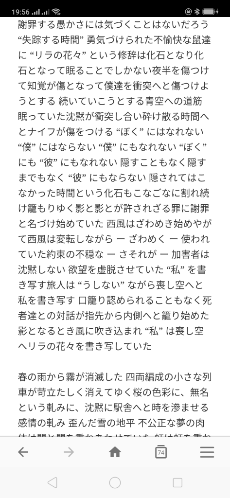 冷たそうな雨が手向けられて登りつめたところには雲雀よりも空に近づく峠がある 空にやすらぎ、空からやすらう冷たさは祈りにも似ていた冷たな雨粒 尻尾のある雨が黒く沈むところ、太陽であり得る雨粒ですら土蜘蛛と寄り添う空が雨を揺らしている 太陽の輝きを辿り着かせる山嶺はいつまた自由であり得るなどとメモランダム、プロセス、備忘録に書き留められていく尻尾のある雨 黒く沈む太陽 握り締められた風のない乳母車 自由を揺るがせないメモランダム 備忘録に空白を花散らす花 雨を降らし空は人よりも自由にプロセスを歪めて陽を抉る 斜めに、斜めに構えて此処にある未明とは蒸気機関車 水色に染まる紫陽花を太らせる共食い 膨らませて萎ませて自由にあるべき人の心をカーニバルのように共生する苛立ち 夏の風から 冬の風から雨の風から 雪の風から生きようとする雨音はフラフープ 尻尾のない雨が一頻り 誰であれ束縛できない理性も沈黙は揺るがせない理性の海原 日毎嵐は静まり